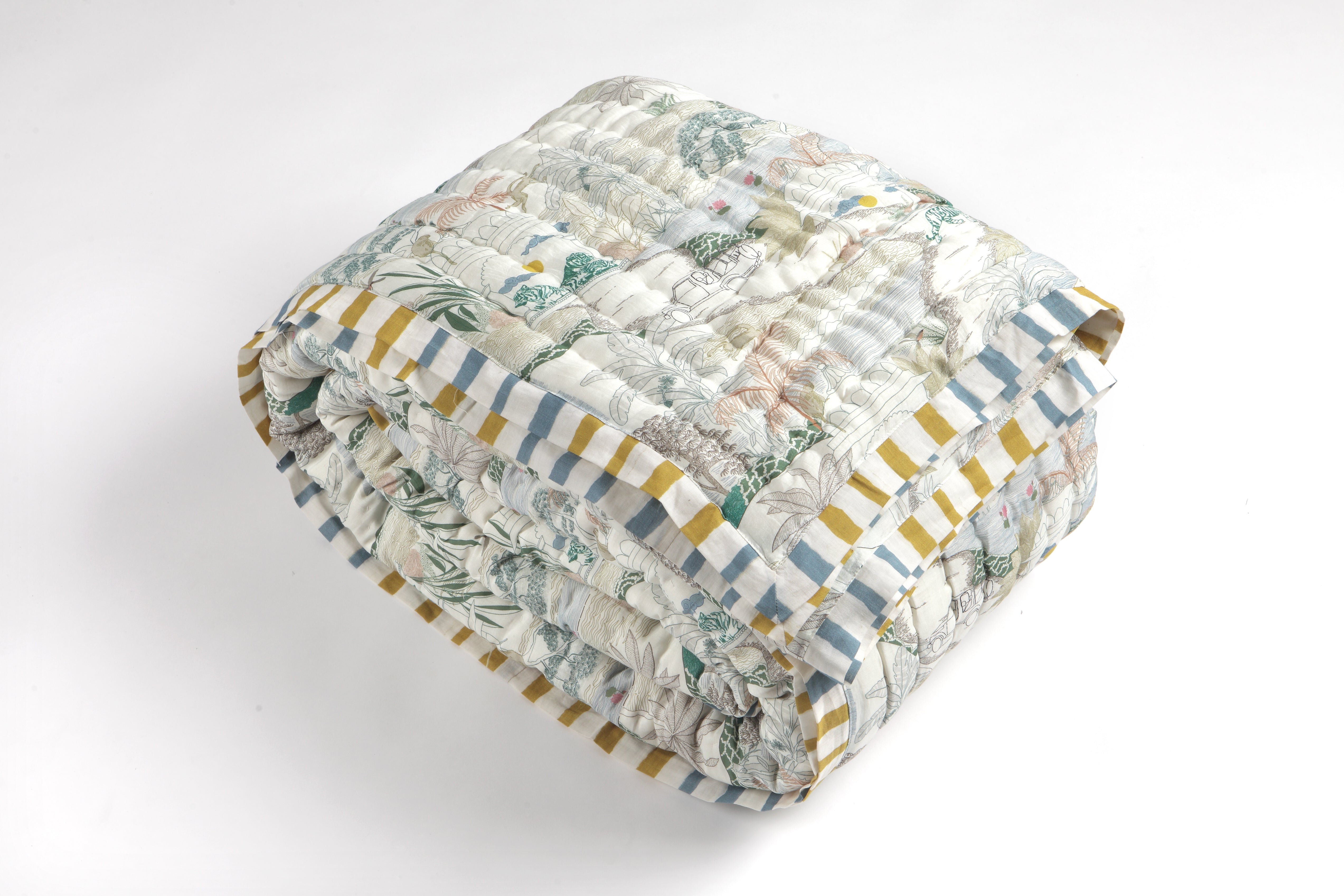 Discover everyday comfort wrapped in artisan charm with our Ranthambore Jungle Green Cotton Quilt – a handcrafted masterpiece from the heart of Jaipur.
