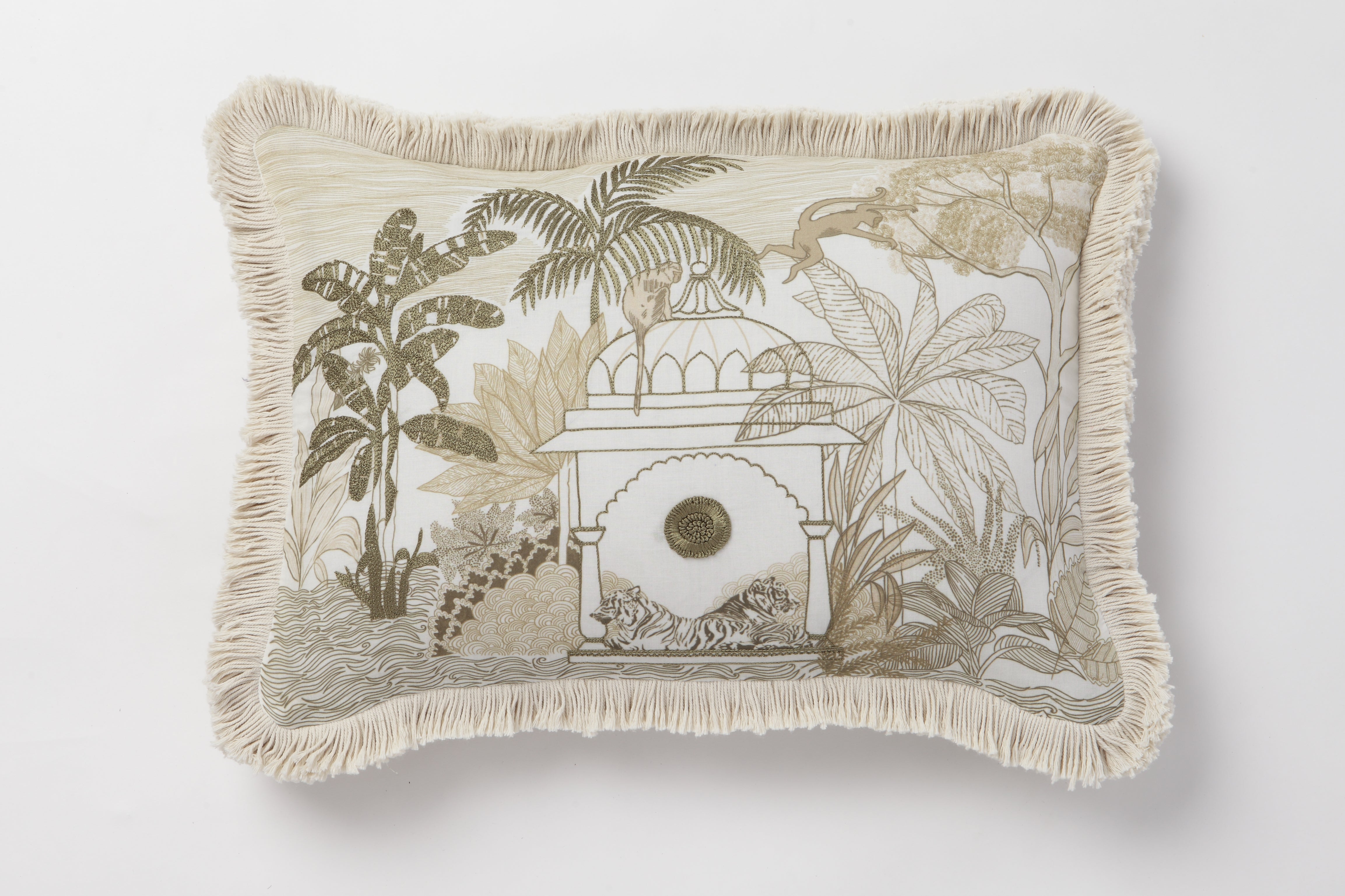 Inspired by the wild beauty of the forest, the Ranthambore Cushion brings artisanal detail and quiet luxury to your space. Crafted in a soft cotton-silk blend, it features a printed base beautifully hand embroidered to enhance every motif. Finished with handcrafted frayed edges, this 12”x16” cushion is a perfect accent for layered, textural decor. The cushion comes with a filler.