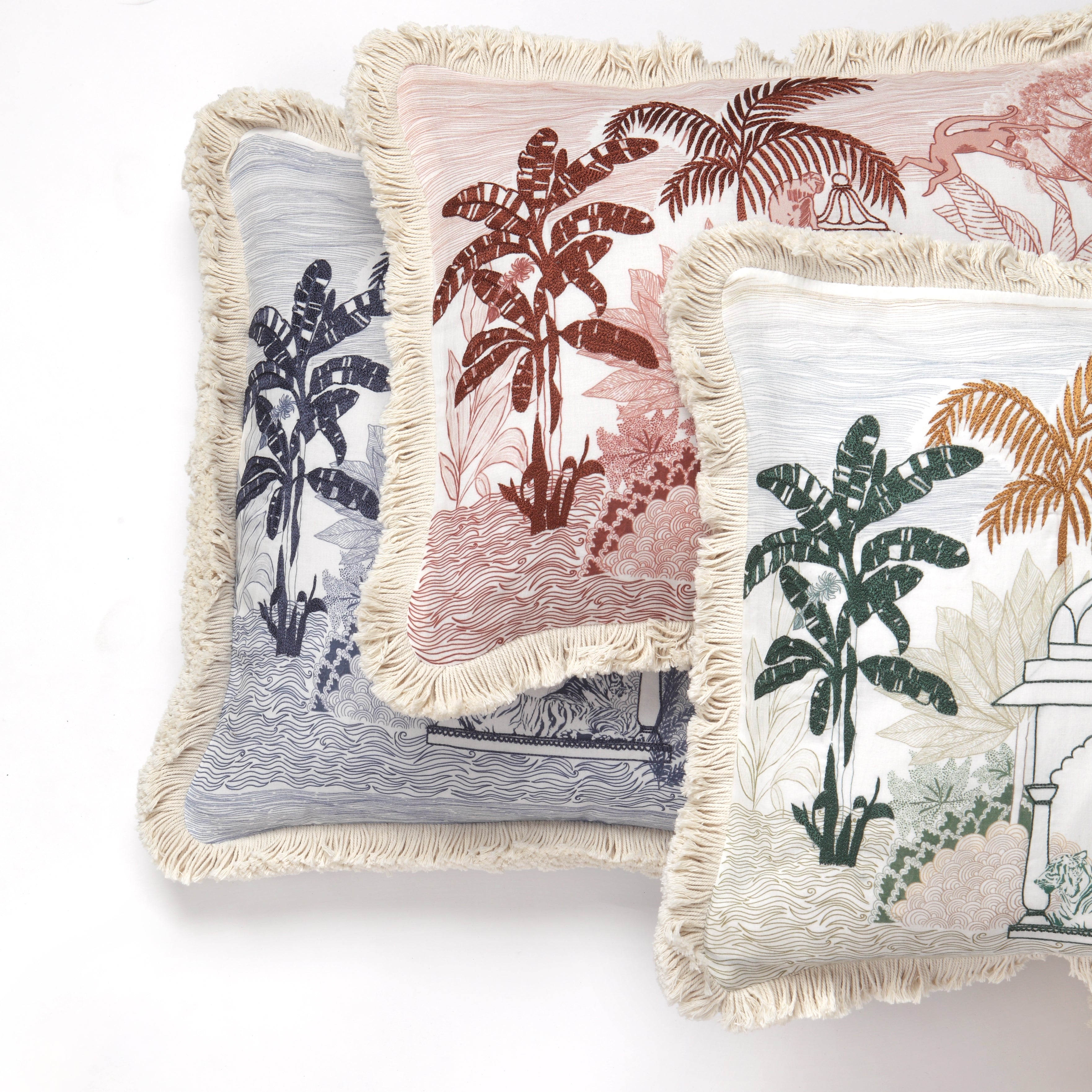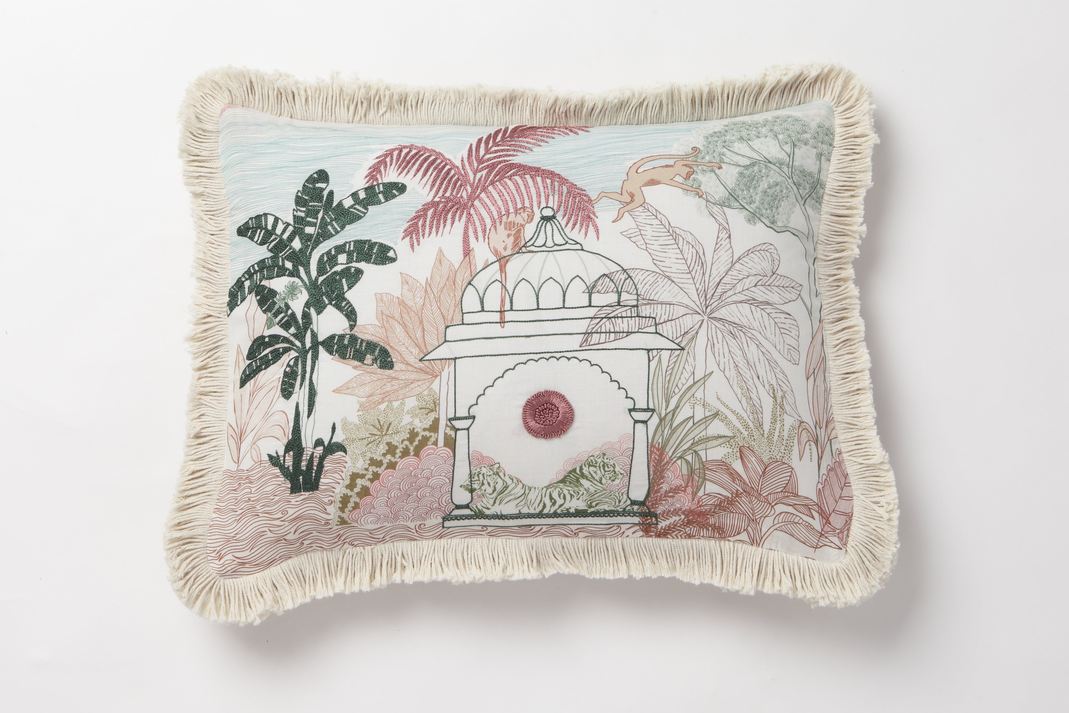 Inspired by the wild beauty of the forest, the Ranthambore Cushion brings artisanal detail and quiet luxury to your space. Crafted in a soft cotton-silk blend, it features a printed base beautifully hand embroidered to enhance every motif. Finished with handcrafted frayed edges, this 12”x16” cushion is a perfect accent for layered, textural decor. The cushion comes with a filler.