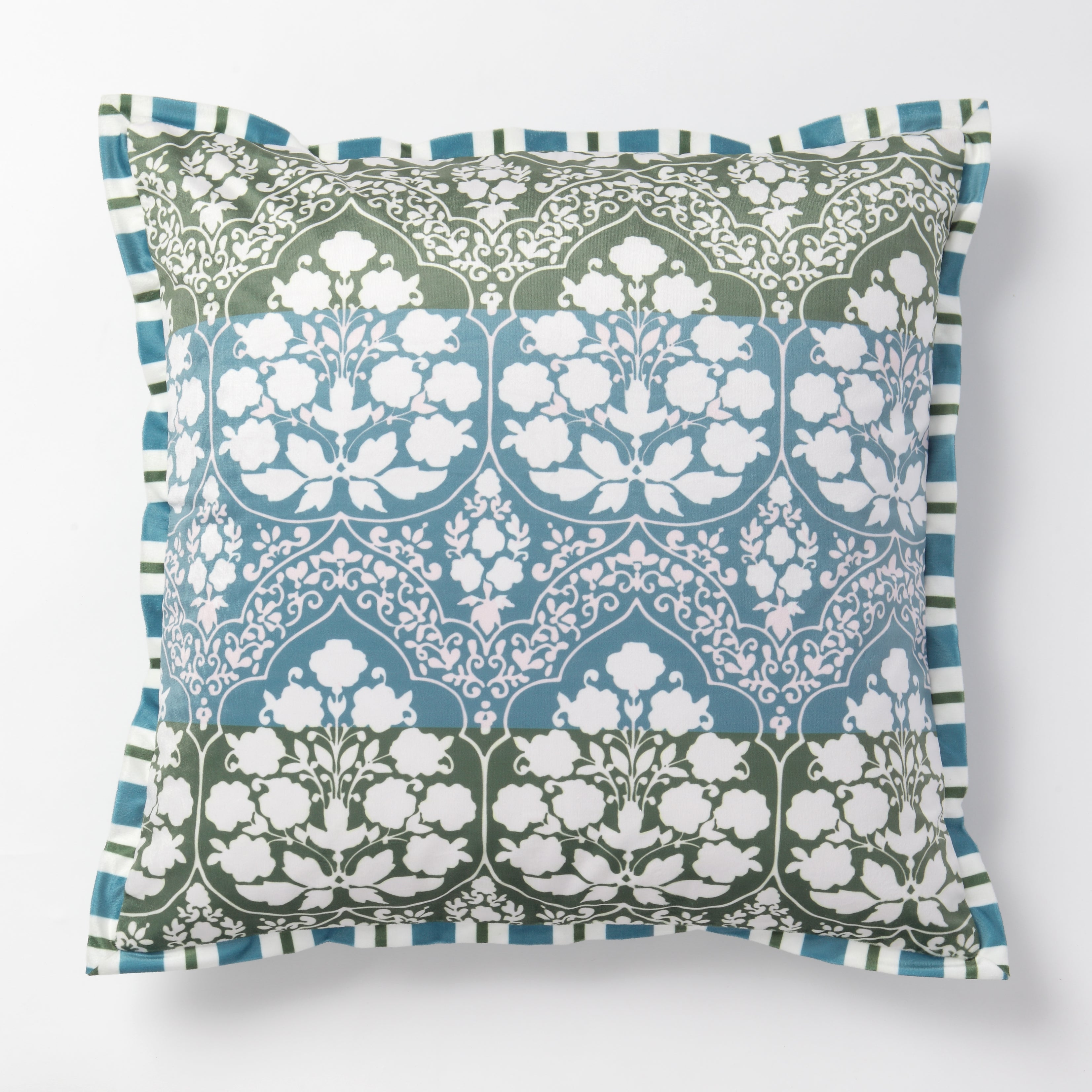 Turquoise Jade Velvet Cushion with Striped Border – 20"x20"