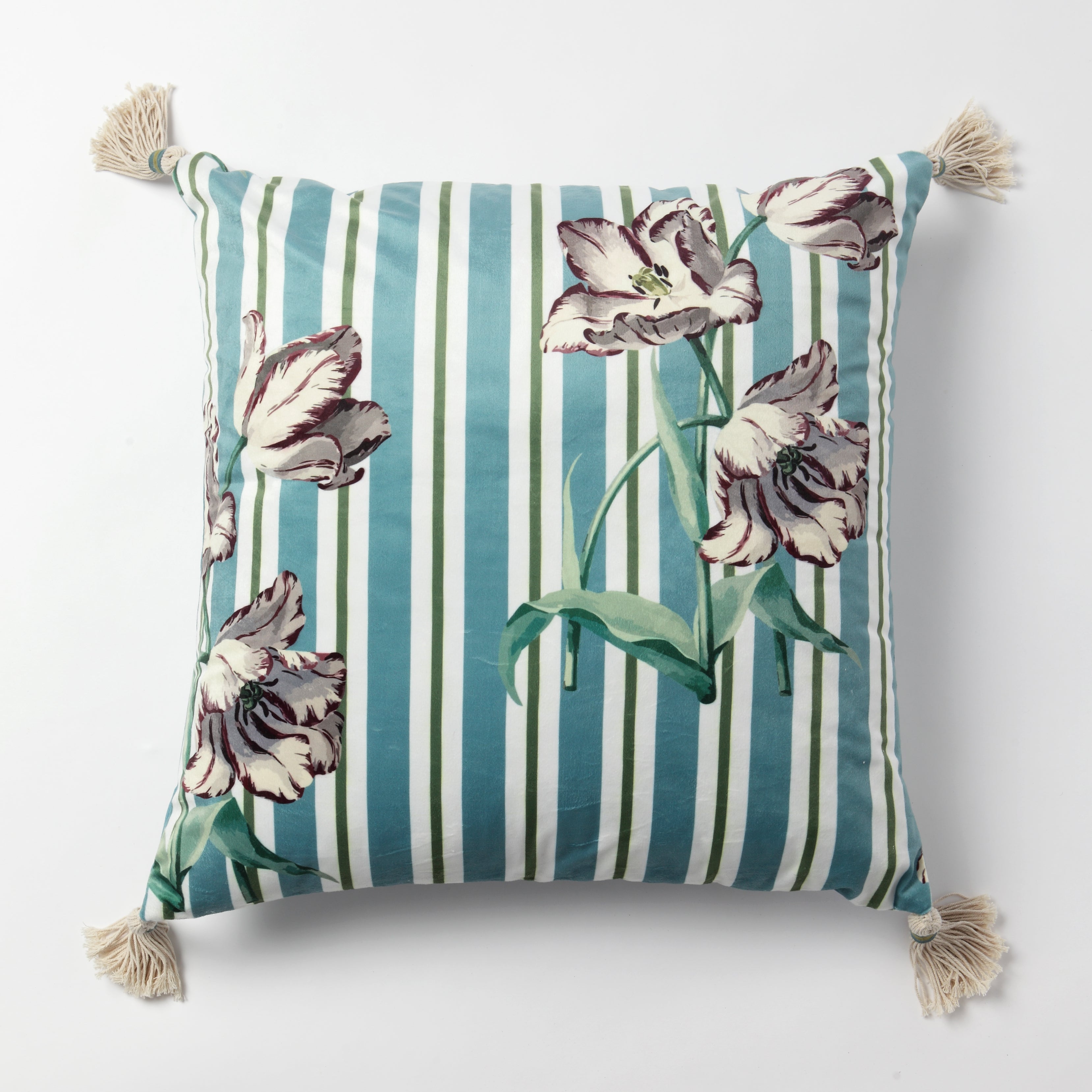 Vintage Bloom Antique Teal Cushion – 20x20 | Printed Velvet with Handcrafted Tassels