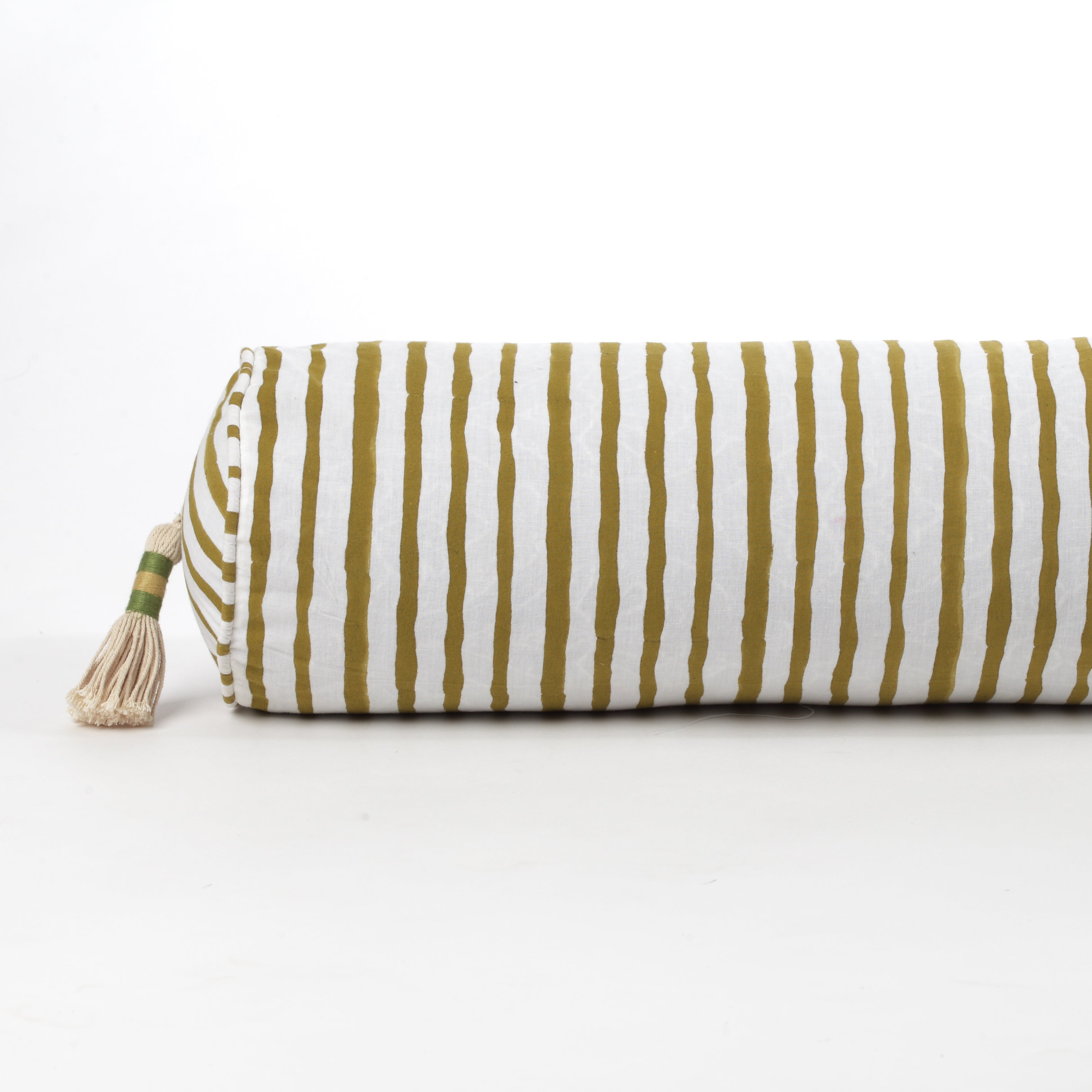 Sandalwood Cotton Bolster with Strips Block Print and Tassel Detailing