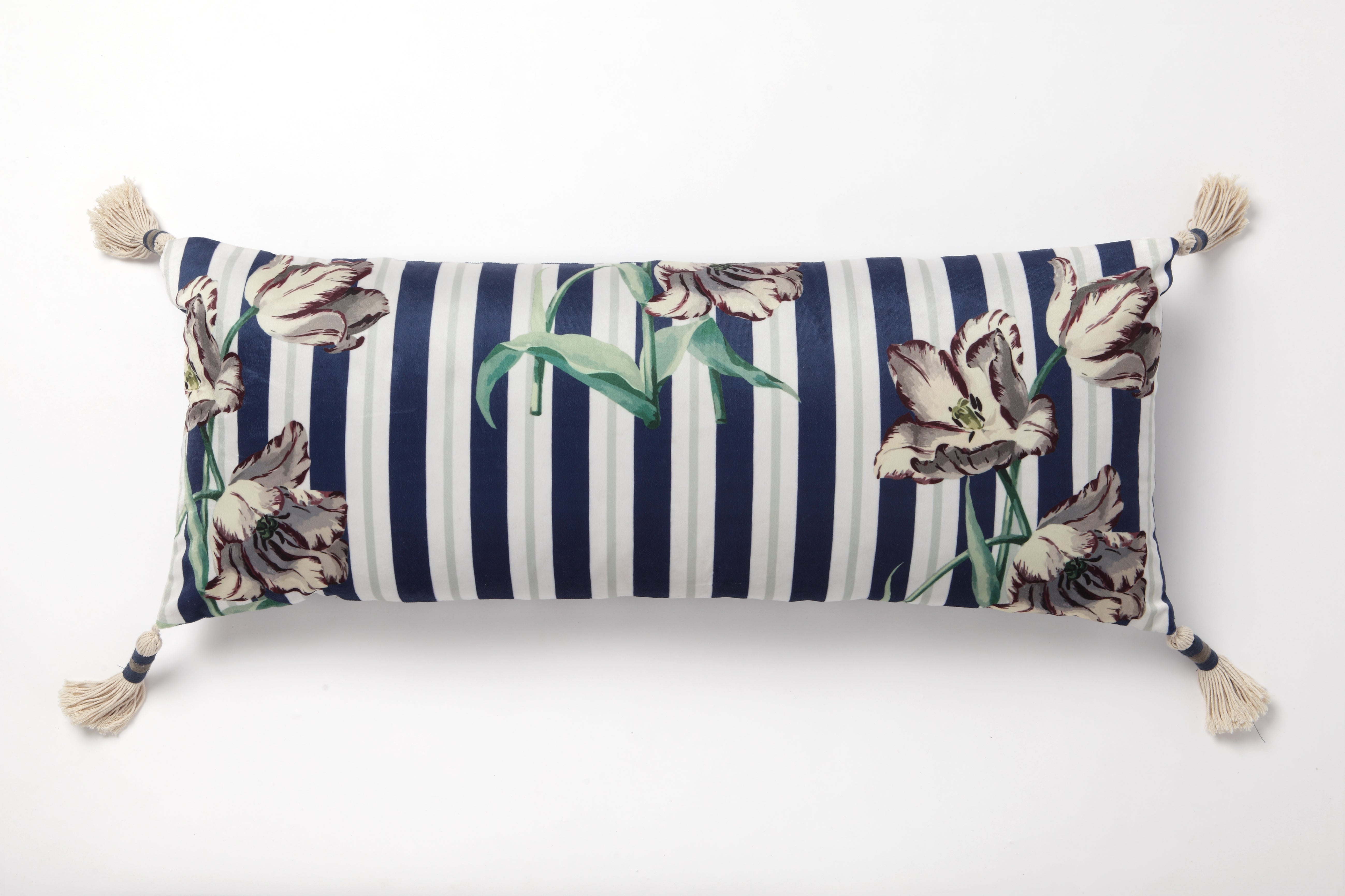 Vintage Indigo Bloom Lumbar Cushion – Velvet printed with handcrafted Tassels