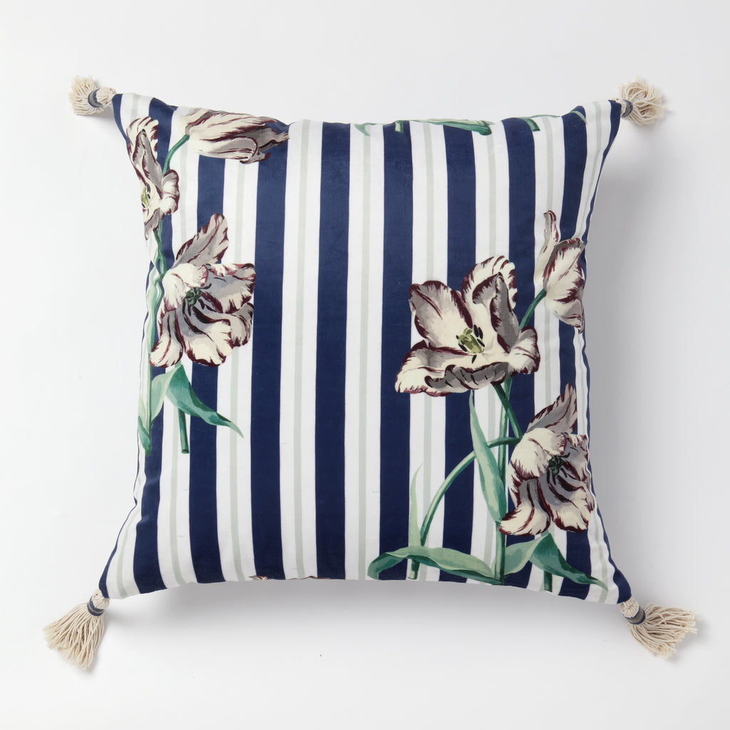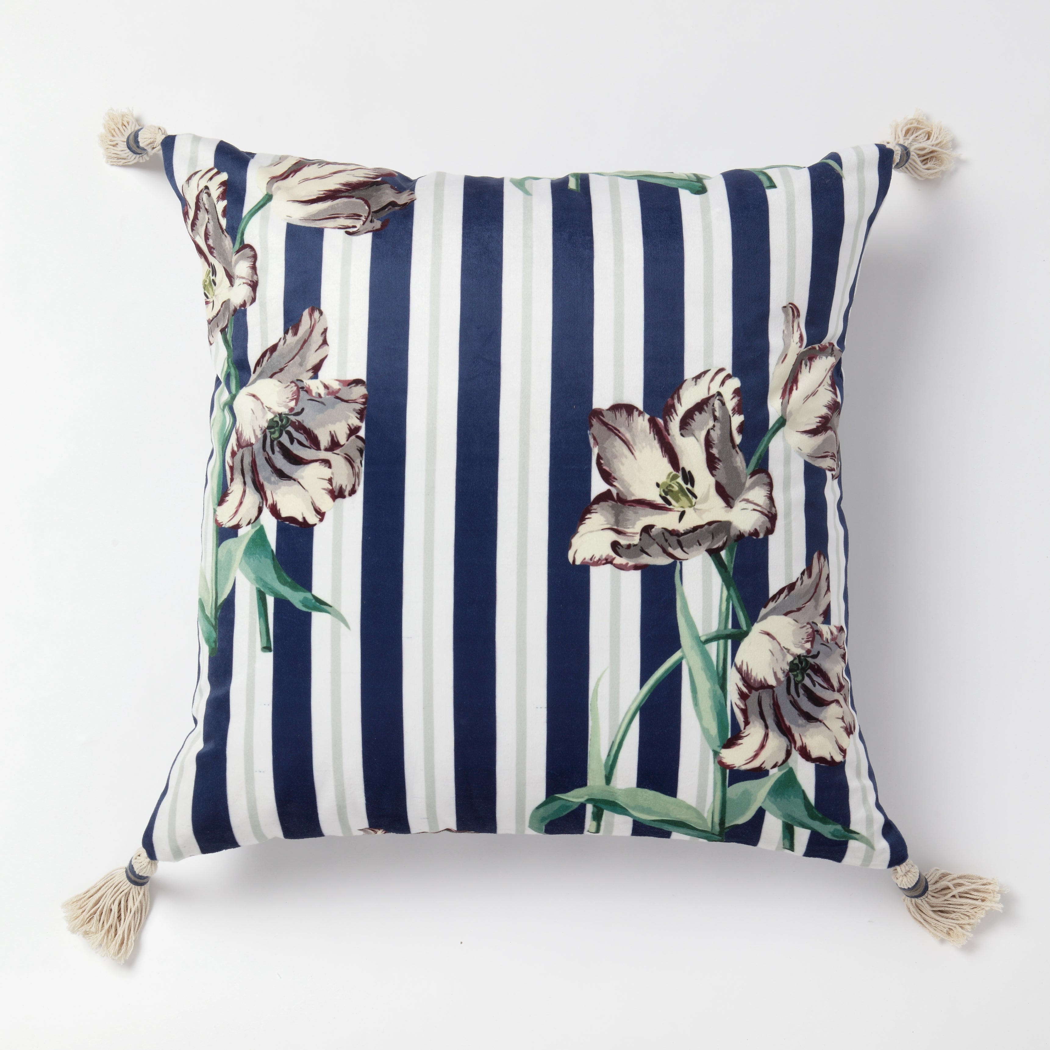 Vintage Bloom Indigo Cushion – 20x20 | Printed Velvet with Handcrafted Tassels